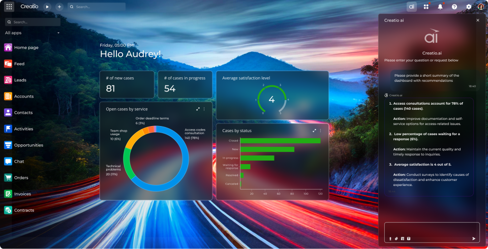 - AI-powered dashboard creation. You can now ask Creatio.ai to generate fully operational dashboards that contain the appropriate data, filters, and visualizations tailored to your specific needs.